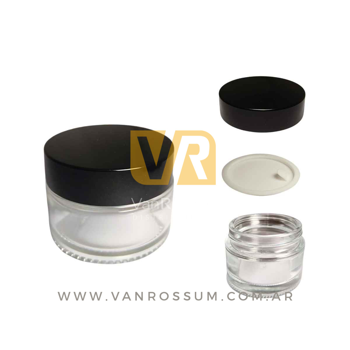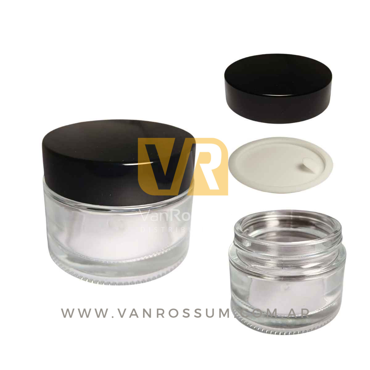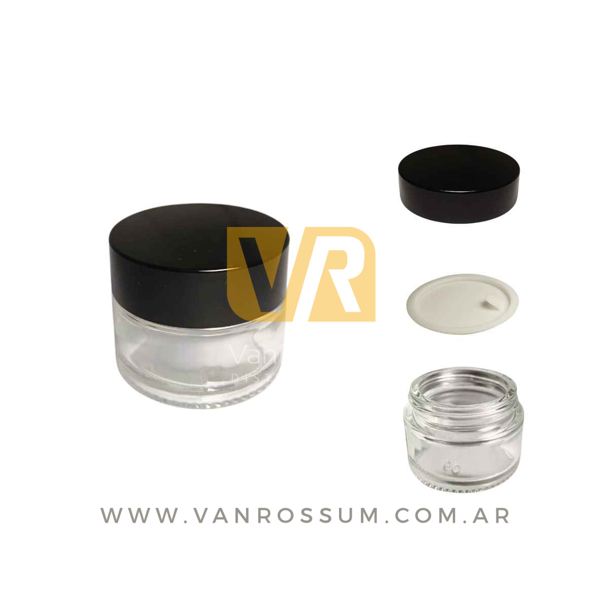 POTE RECTO TRANSPARENTE 50 ML. (DE VIDRIO C/ TAPA NEGRA)